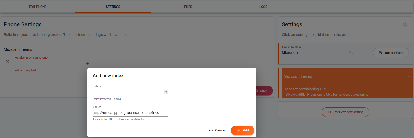 - Select: Handset provisioning URL