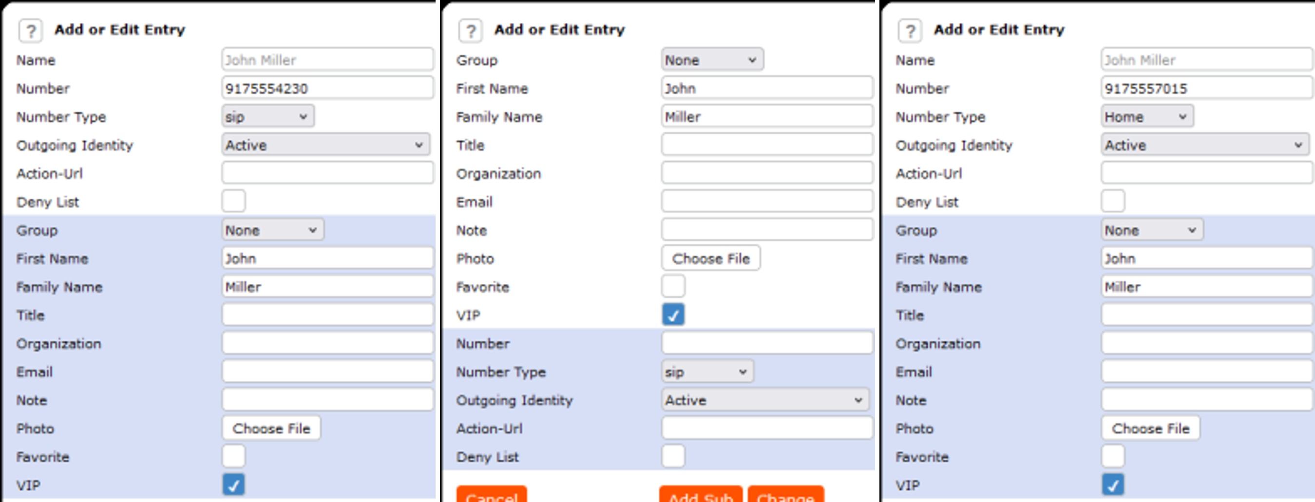 Each entry must have at least one phone number; multiple associated phone numbers are possible. If you do not enter a first and/or last name and/or nickname, the phone number will appear under both "Name" and "Number".