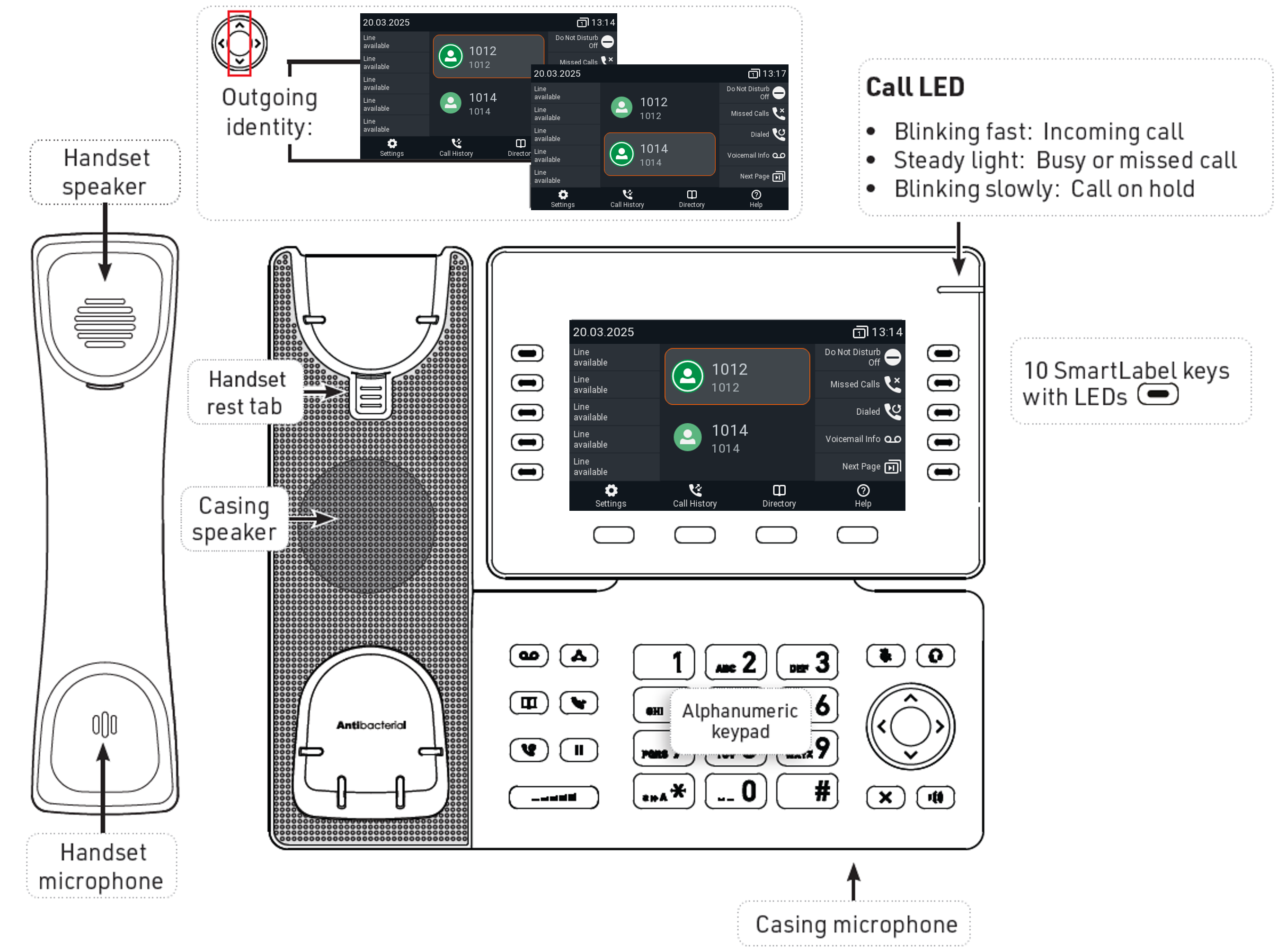 The phone has 10 built-in ringtones that can be assigned to identities, group types, and contact types.
