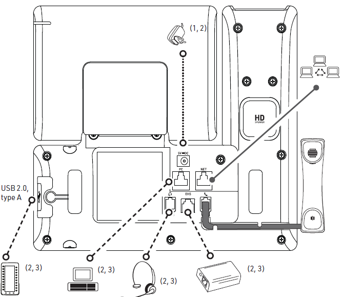 The phone can be operated with Power over Ethernet (PoE) provided via the network cable or, if PoE is not available in your network, with the separately available 5V DC power adapter.